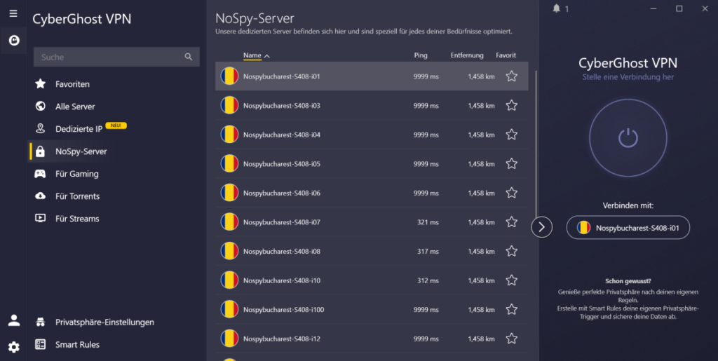 Neben den regulären Servern betreibt CyberGhost in seinem eigenen Rechenzentrum in Bukarest eine separate Infrastruktur, die sogenannten NoSpy-Server. Der Unterschied zu normalen Servern: Reguläre VPN-Server werden oft in Co-Location-Rechenzentren betrieben, wo auch die Rechenzentrumsbetreiber physischen Zugang haben könnten.