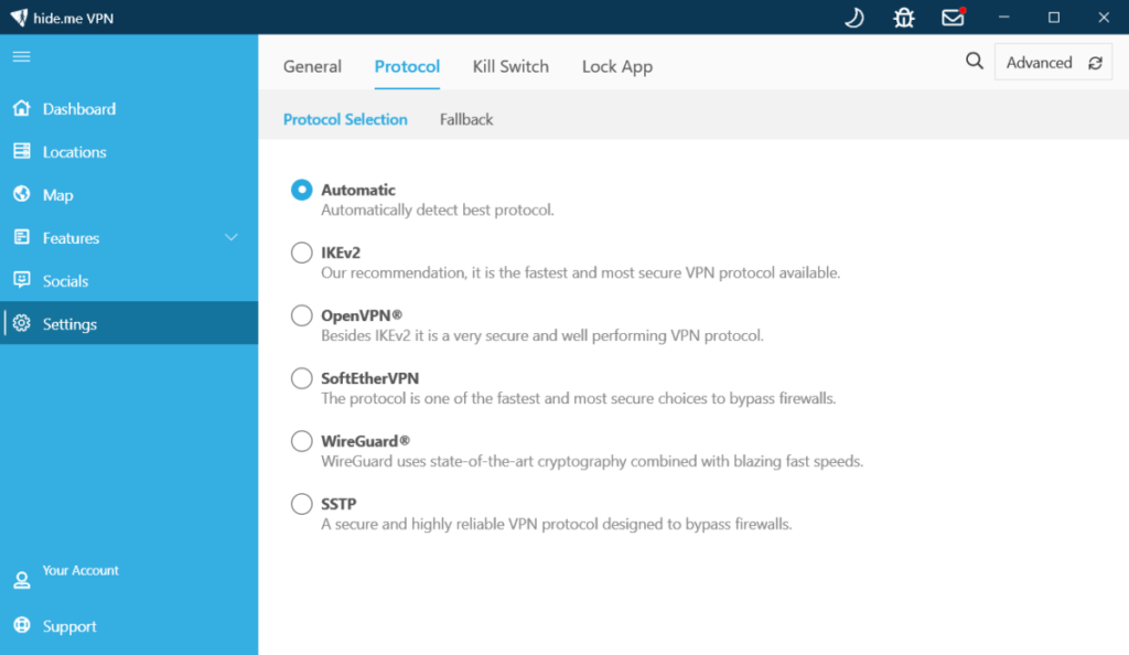 hide.me verschlüsselt den Datenverkehr mit AES-256 (bei OpenVPN) oder ChaCha20 (bei WireGuard). Beide gelten als unknackbar nach aktuellem Stand der Technik. An Protokollen stehen WireGuard, OpenVPN, IKEv2, SoftEther und SSTP zur Verfügung, wobei SoftEther und SSTP nur unter Windows funktionieren. Standardmäßig wählt die App automatisch das schnellste Protokoll. Wer Kontrolle will, sollte manuell auf WireGuard wechseln, das sowohl schneller als auch sicherer ist als die meisten Alternativen.