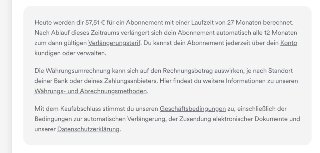 Das eigentliche Problem liegt in der Verlängerung. Nach den ersten zwei Jahren erneuert sich das Abo automatisch zum deutlich höheren Jahrespreis, beim Starter-Tarif ungefähr das Doppelte des ursprünglichen Monatspreises. Surfshark schickt einen Monat vorher eine E-Mail, aber auf der Hauptkaufseite kommuniziert Surfshark diesen Preissprung nicht prominent. Das grenzt an irreführende Preisgestaltung, und wer das nicht erwartet, zahlt plötzlich mehr als doppelt so viel. Wer das 2-Jahres-Abo abschließt, sollte sich einen Kalenderhinweis für Monat 23 setzen und dann aktiv entscheiden: kündigen und neu abschließen oder verlängern.