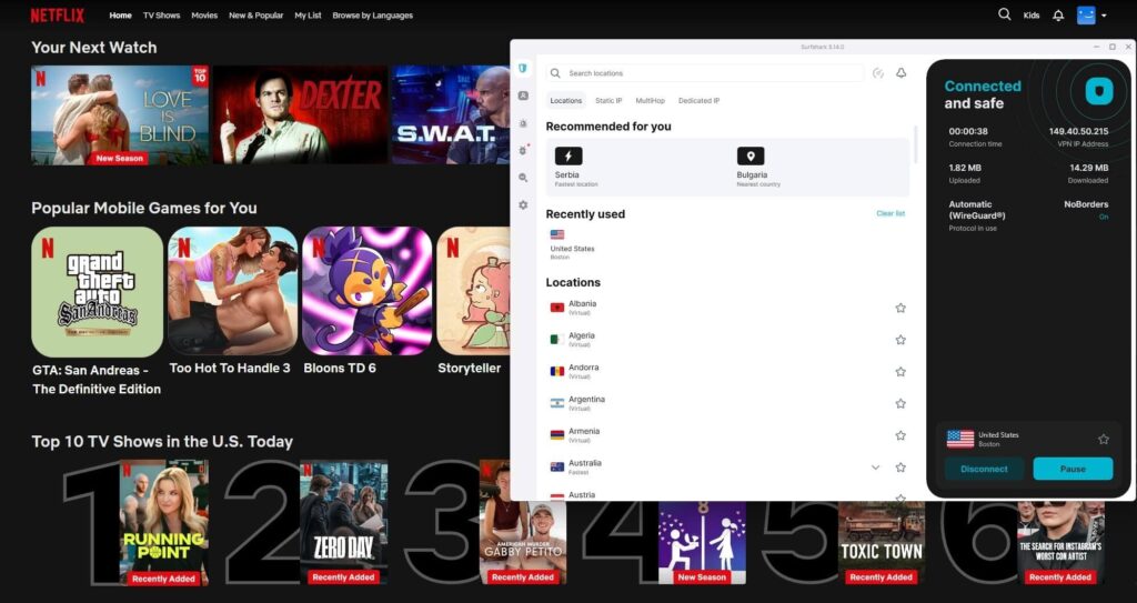 Bei Netflix habe ich in verschiedenen Testregionen zuverlässig Zugang bekommen, darunter USA, Großbritannien, Japan und Deutschland. Surfshark setzt dabei auf keine dedizierten Streaming-Server, wie es zum Beispiel CyberGhost tut. Stattdessen sollen alle Server Streaming unterstützen, was meistens stimmt. Einmal musste ich bei Netflix USA den Server wechseln, bevor der Stream startete. Das ist kein Einzelfall in Surfshark-Tests, aber auch kein dauerhaftes Problem. Wer lieber ohne dieses Risiko streamt, bekommt mit NordVPN oder ExpressVPN etwas zuverlässigere Ergebnisse, zahlt dafür aber deutlich mehr.